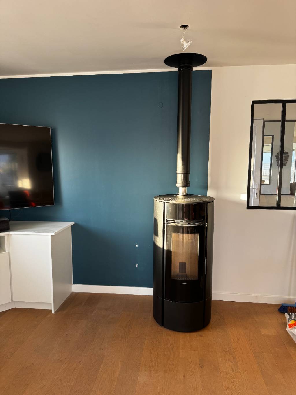 Installation d'un poêle à granulés de marque Klover OS8K - Super 7 -2,6 à 7,4 KW couleur Noir dans une maison chauffée par des radiateurs électriques.