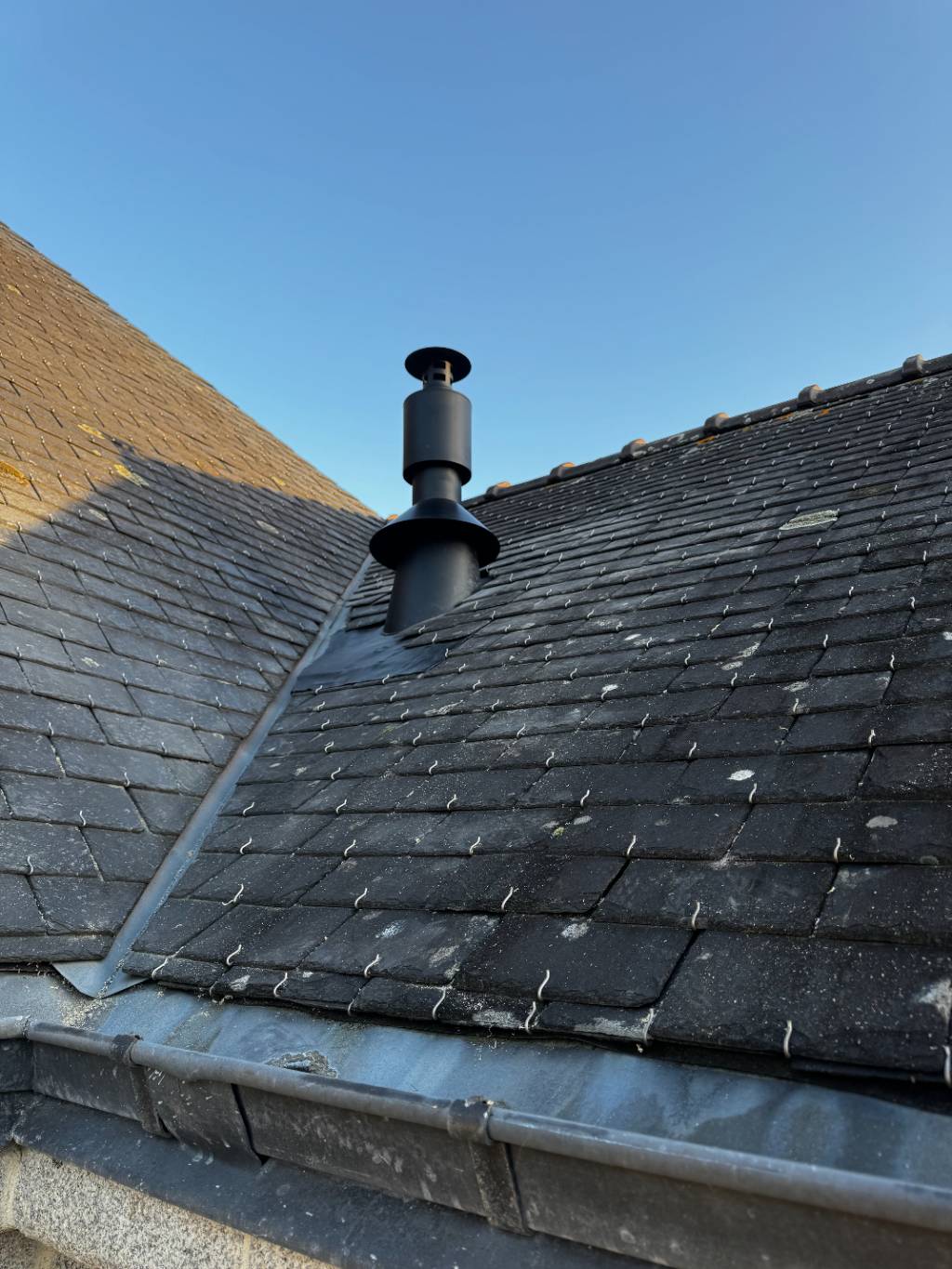 Raccordement avec conduit ventouse concentrique verticale noire gamme Twin biomass de marque Jeremias France.