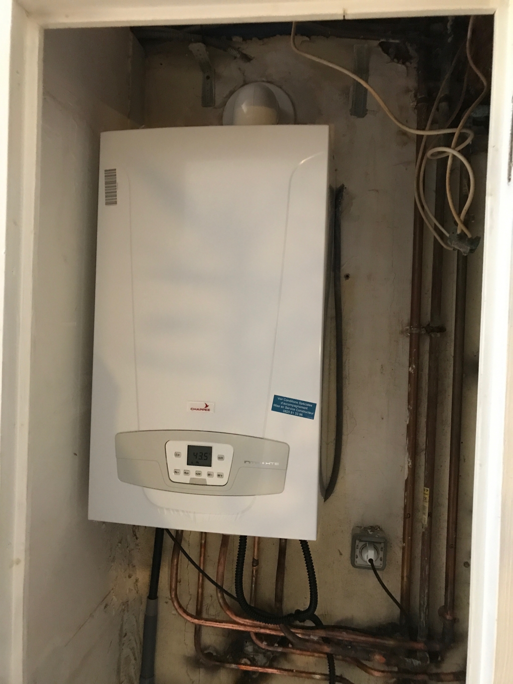 Installation d'une chaudière gaz murale vetouse horizontale Chappée Initia + 2,24 HTE avec production eau chaude sanitaire. Remplacement d'une chaudière basse température ELM Leblanc Désambougae du circuit de chauffage et radiateurs.
