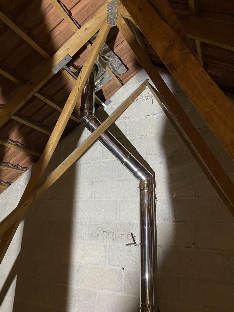 Création d'un conduit de fumée en tubage isolé de diamètre 100. Conduit de raccordement en tubage 80 de marque Jeremias.